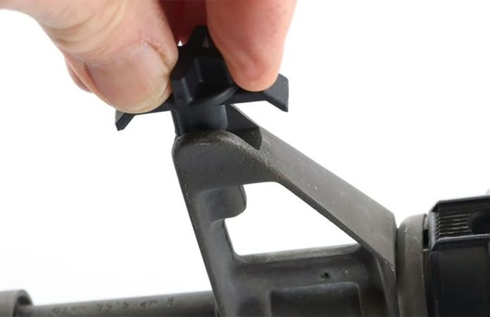 This is a special plastic and brass tool that fits onto and over the front sight, depresses the plunger and rotates the sight post, with tactile clicks as it rotates each quarter-turn. The military manuals will tell you that you can use the tip of a cartridge and it can do the job, but that’s often laughable.