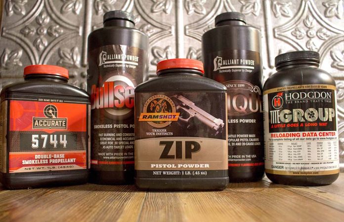 Ramshot’s ZIP is another do-all pistol powder, which generates good velocities and accuracy from low charge weights. Burning a bit too fast for the magnum-class cartridges, it’s a sound choice for the 9mm Luger with all bullet weights, and my Sig Sauer 1911 .45 ACP simply loves 5.6 grains of this powder with a good 230-grain projectile. A double-based flake powder, ZIP meters very well and it’s easy on the wallet. I find myself reaching for this powder quite often.