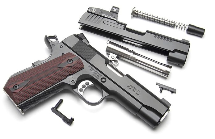 Few have escaped the .45 ACP-9mm debate at some point in their lives. However, it seems Ed Brown may have come up with an answer of which is the better carry caliber—both. This is precisely what the gunmaker’s Kobra delivers with a system that slips seamlessly between the German wonder caliber and the American standard bearer. Shipping with dedicated slides, barrels and components for each cartridge, the 1911 gives you the perfect one-two punch. Ed Brown angles the .45 setup as a bit more of a range tool, with the upper outfitted with fixed sights, while the 9mm is meant for carry with the EVO upper coming outfitted with a Vortex Venom red dot. It’s quite a package all wrapped up in one gun.
