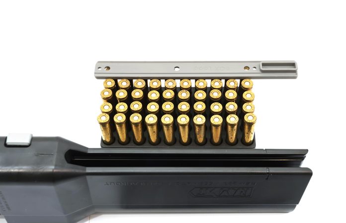 The system is easy. Take the main housing and slide it onto a magazine. It locks in place, using the magazine latch slot. If you’re using loose ammo, slide the rear plate off, drop rounds into the slot and slide the plate back on. Then, use the rammer to shove them into the magazine.