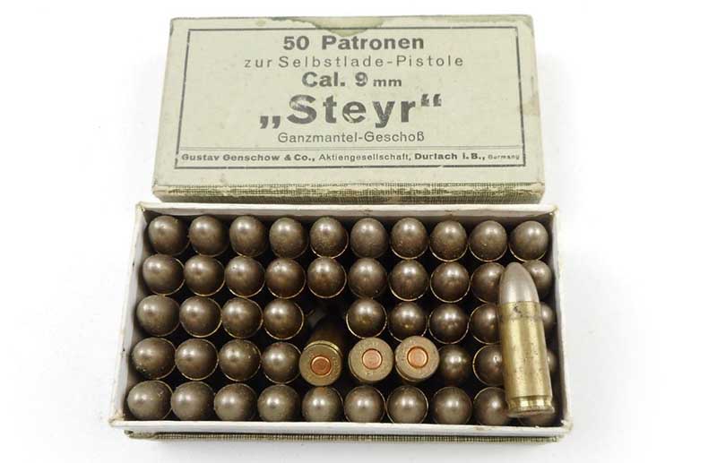 9mm Steyr is the standard Austrian military pistol cartridge for the Steyr Model 1912 auto pistol. Its case is approximately 23 millimeters long, as compared to the 9mm Luger, which is 19 millimeters. Apparently, the only other countries besides Austria to use this as a military round were Romania and Chile, which adopted both the Steyr pistol and cartridge in 1912.
