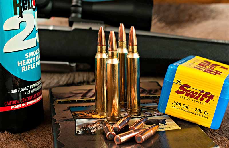 During the past two decades, I’ve used Reloder 19, 22, 23, 25 and 26, IMR 4064, 4350 and 4831, Hodgdon H414, H4350, H4831SC and H1000, in addition to others. You’ll want a powder on the slower side of things, without needing to use so much that the load is heavily compressed. I like a column that takes up about 90 percent of the available volume.